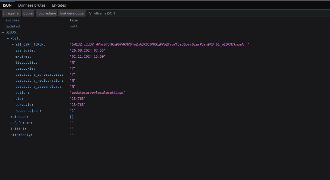 | Description | When trying on index.php/surveyAdministration/rendersidemenulink?subaction=publication&surveyid=XXX to change the Publication date > Expiry date/time index.php/admin/database/index/updatesurveylocalesettings do the job but return an alert: (see screen snapshot too) success true nb: my mode debug is inactive: grep debug config.php | ||||