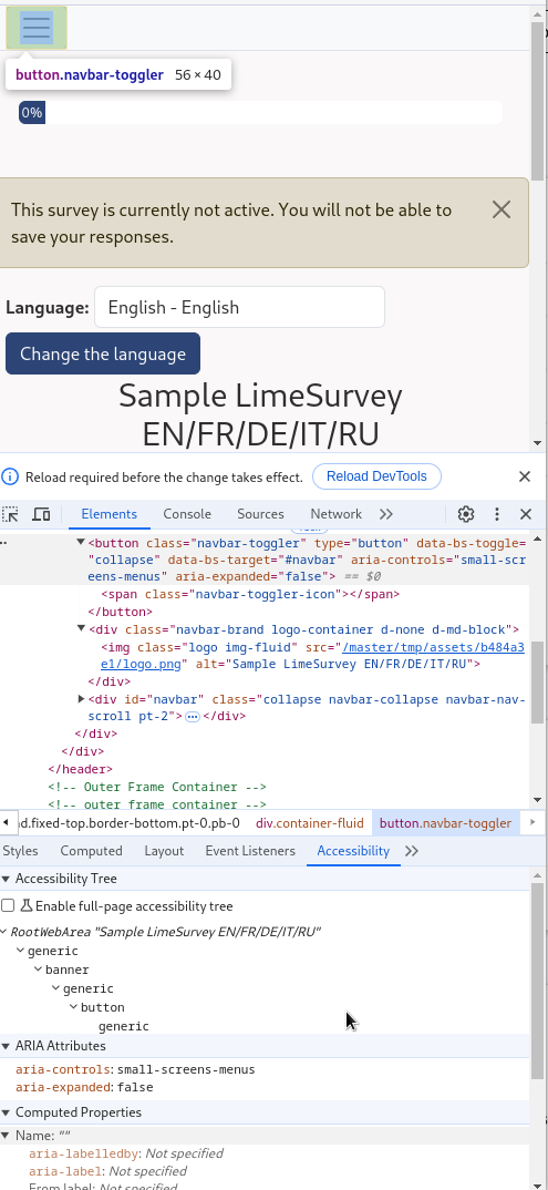 | 2024-11-20 10:48 | DenisChenu | Summary | Hamburger menu need a accessible text => Hamburger menu need a accessible text (Vanilla theme) |
