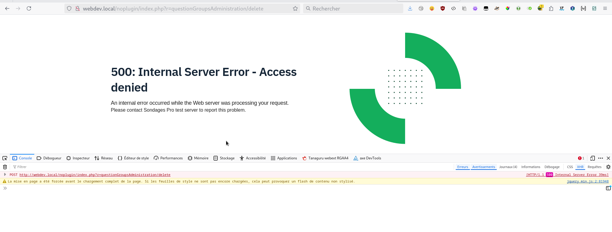 | Steps To Reproduce | Steps to reproduceSend a POST value to questionGroupsAdministration/delete with a survey activated and a real group Expected resulthave a 403 error or a 400 error about deletion Actual resultHave a 500 error | ||||