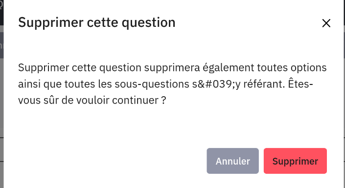 | Description | The bug is still here - more information here : https://bugs.limesurvey.org/view.php?id=19818 When you show the warning message before deleting a question in French, there is a wrong characters displayed. Supprimer cette question supprimera également toutes options ainsi que toutes les sous-questions s'y référant. Êtes-vous sûr de vouloir continuer ? | ||||
