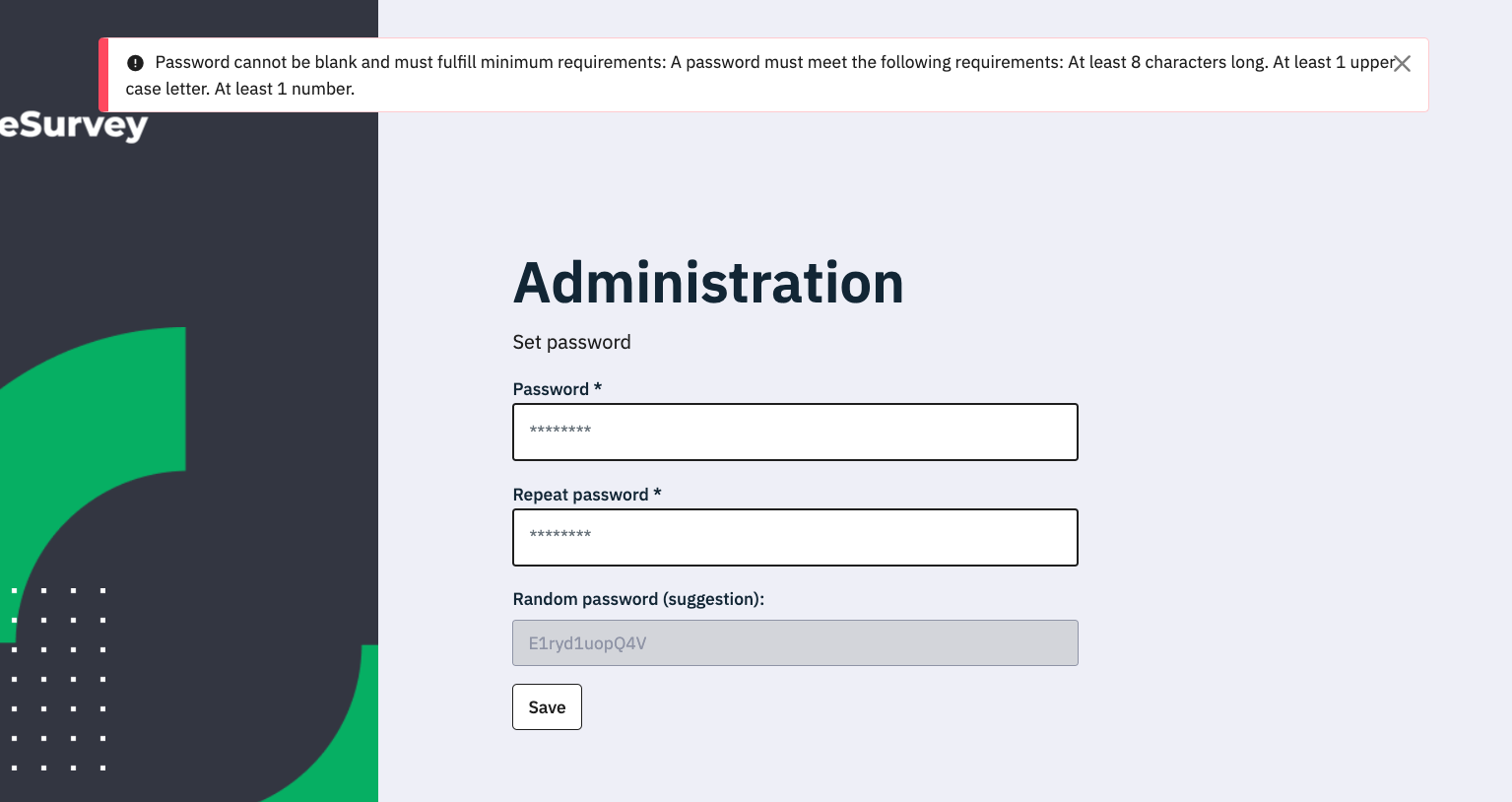 https://github.com/LimeSurvey/LimeSurvey/pull/4164 Before the fix, the error message showed all the rules, not just the one which was failing. It is to highlight that using the prior approach would only work for standard rules, not for rules set in the plugin: it is impossible to know the rules set in the plugin. For that there would have to be a new plugin event (or as workaround call the plugin empty password from User::getPasswordHelpText()) As a suggestion, I think the screen should show the rules in the screen it self before a password is submitted, calling the helptext method from the screen rendering. |