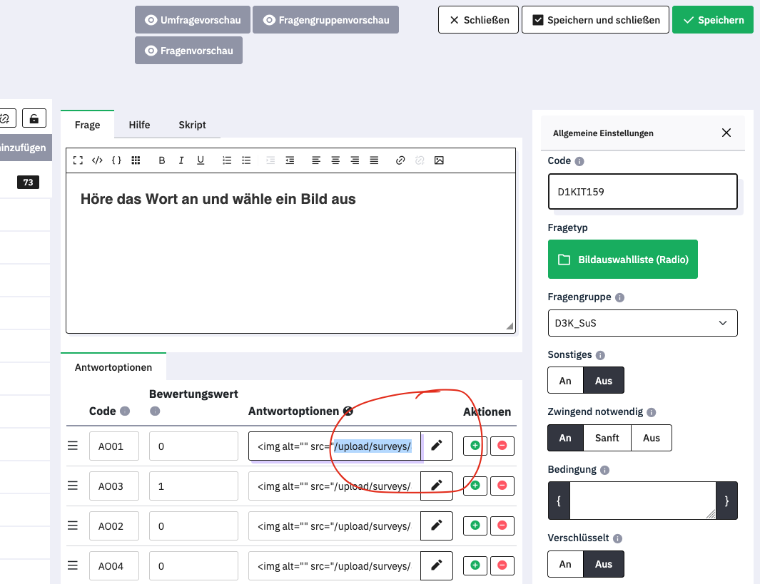 | Steps To Reproduce | Steps to reproduceChoose "Bildauswahlliste (Radio)" Expected resultEditor to edit answer option Actual result403 Verboten - Ungültige Umfrage-ID | ||||