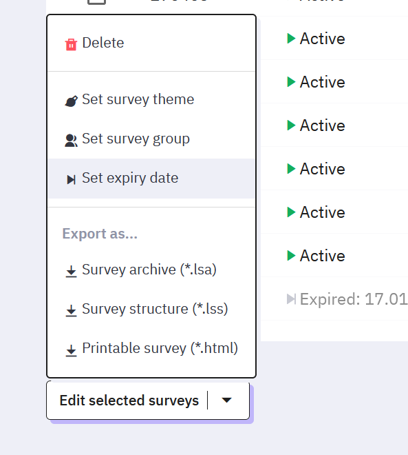 | Description | Main page > Surveys list > Edit selected surveys > Set expiry date does not work. I tried to set an expiry date on several surveys and nothing happens. | ||||
