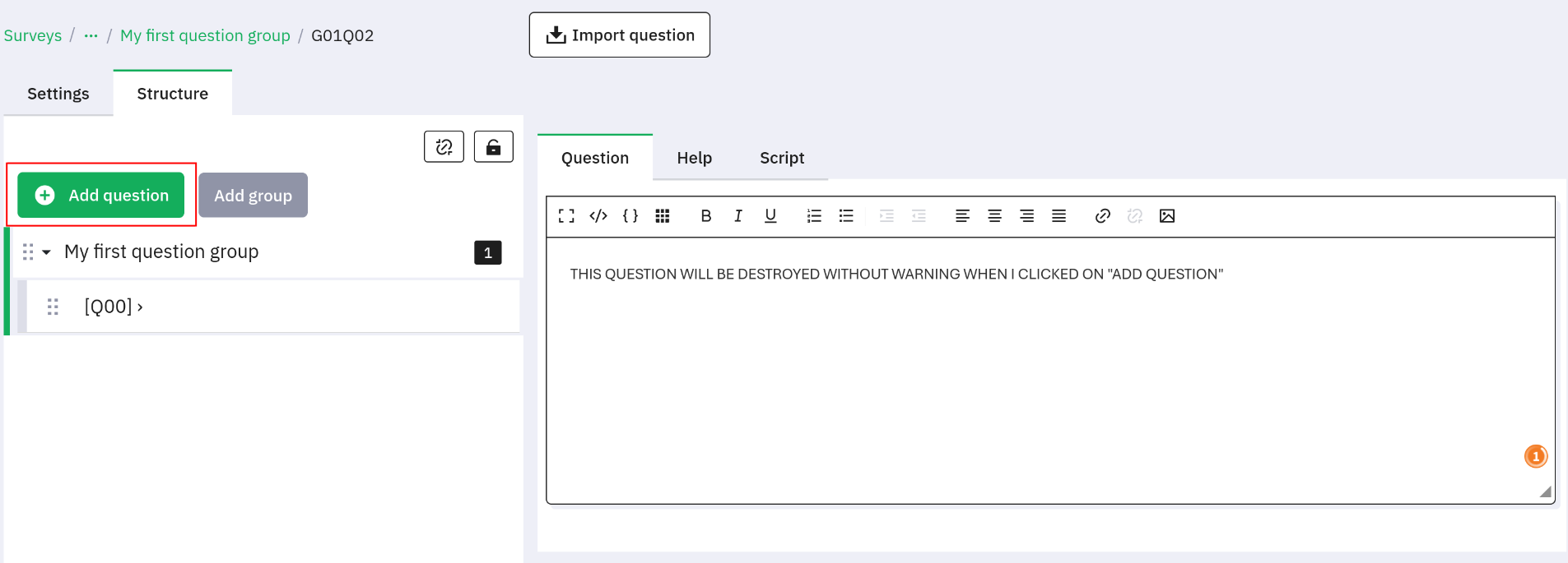 | Description | When a survey is created, the administrator can create groups and questions. In a question, it is possible to fill it, and, before saving, clicking on the green button "Add question" with a result of refreshing the page and losing everything. | ||||