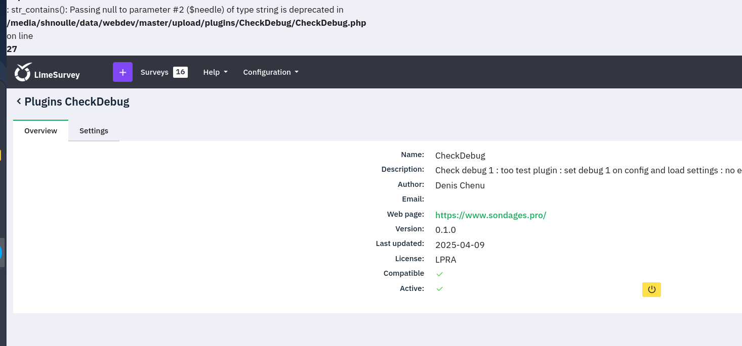 | 2025-07-11 17:59 | DenisChenu | Summary | debuig:1 still send deprecated error => debug:1 still send deprecated error |