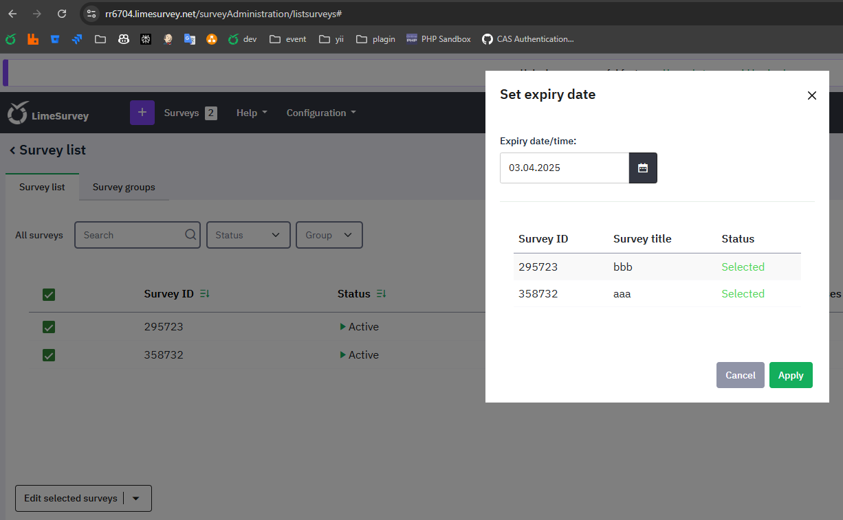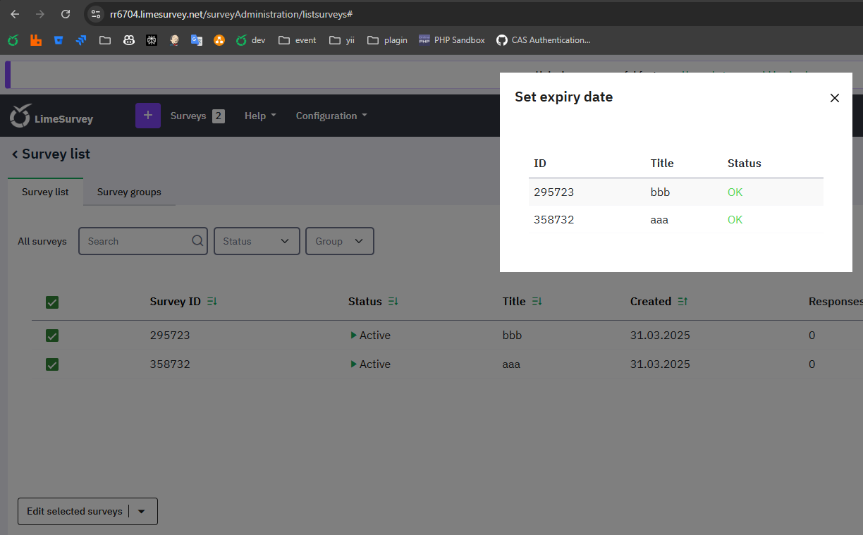 | Steps To Reproduce | Steps to reproduceI've created and activated two surveys. Expected resultI expected set expiration dates for both surveys. Actual resultNo survey has a set expiration date. | ||||