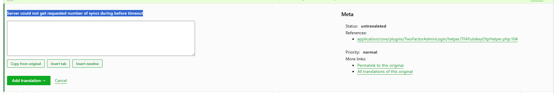 Hi @gabrieljenik, any news on this? Can't really translate what isn't clear. Not sure how the translators for the other languages that are at 100% right now did it, but I am not even sure what it is supposed to mean. Looking at the German translation by Carsten, it is probably supposed to be "Server could not get requested number of syncs before timeout", at least that is what it has been translated to in German. I think the Dutch version is translated similarly. Catalan has been translated incorrectly in my opinion (but I am not an expert on Catalan), the other languages I don't really understand (Japanese, Czech, Polish). |
