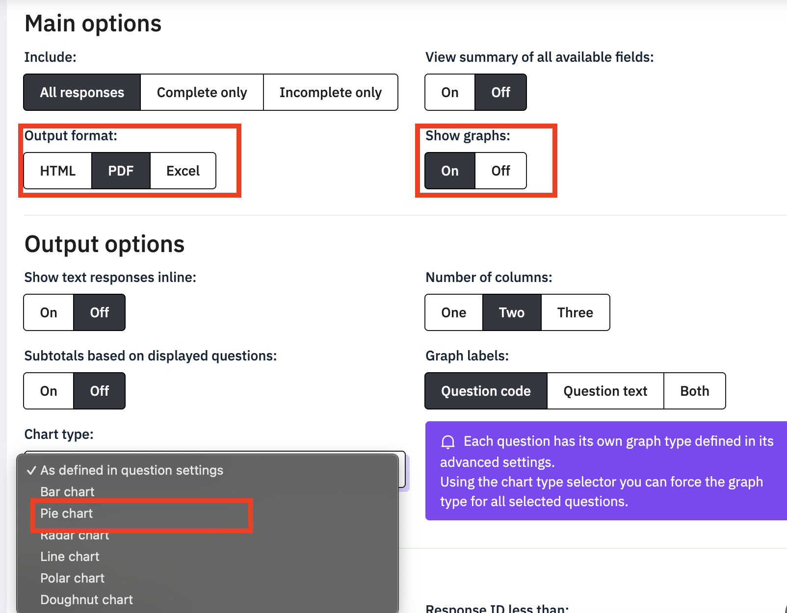 https://github.com/LimeSurvey/LimeSurvey/pull/4298 Problem here is that PDF doesn't implement all chart types. Only bar & pie. So, disabled the possibility of overriding on PDF. Harsh decision :) |