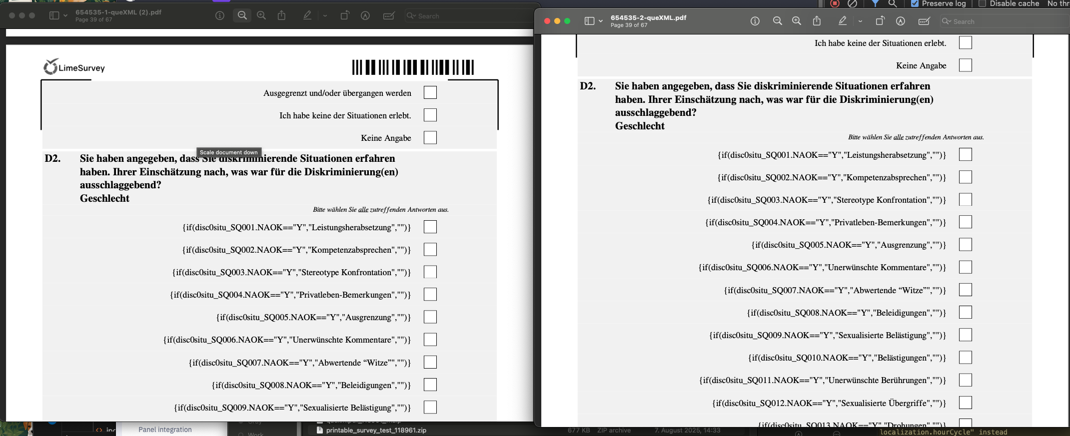 | Description | When enabling the "Print answers" feature at a survey, there is a "Export to queXML PDF" button shown. When exporting the given data set to queXML, EM placeholders do not get replaced and the export looks weird - actually you can not really use it, see attached screenshot. | ||||