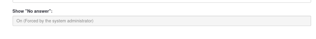 @Joffm You are right, and I appreciate the warning! In fact, the issue was due to the shownoanswer option being set to 1 instead of 2, which is necessary to allow the configuration inherited from the administrator settings. $config['shownoanswer'] = 2; // Show 'no answer' for non-mandatory questions (0 = no, 1 = yes, 2 = overridden by survey settings) This option can be set in the LimeSurvey configuration file, but in my case, it was directly stored in the lime_settings_global table in the database. I simply changed the value from 1 to 2, and then the configuration I had set in Configuration → General surveys → Presentation → Show "no answer": Off started working as expected! Thank you |