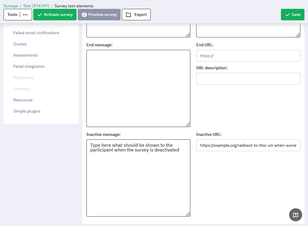 It would be useful if we could choose a custom message (like "the survey is momentary unavailable, please retry later", or "the survey ended, sorry!") in the "Text elements" section. Or a URL were the user should be redirected. (I provided a quick mock-up in the attachments) Thanks in advance | ||||