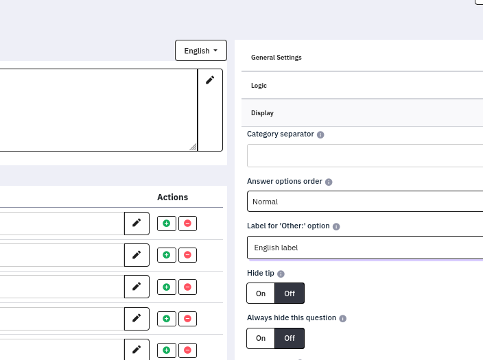 | Description | We are using Limesurvey community edition and are really happy with it. I think I have found a glitch in your quick-Translation. We have a question (List (dropdown)) with other option enabled and also the "Label for 'Other:' option" set. This works great in our main language (german), but I never saw a possibility to translate this label to the other languages used for the survey. The other languges still display the standard 'Other:' label. | ||||