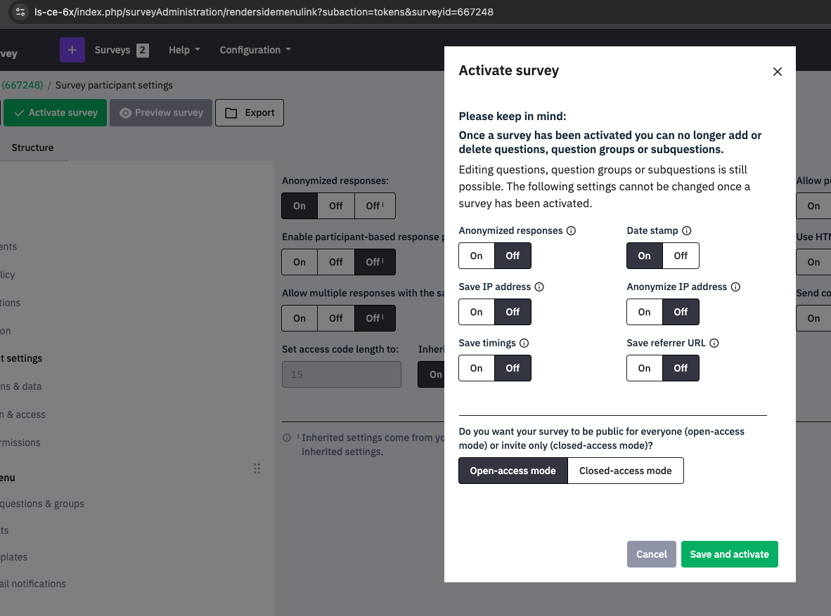 | Description | If you activate a survey when in "Participant settings", the toggle "Anonymized responses" in the "Activate survey" modal does not work. | ||||