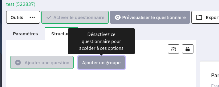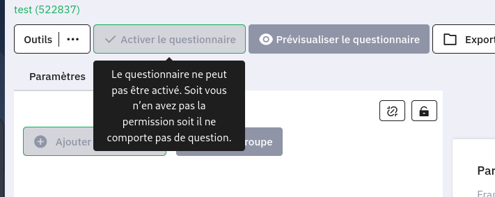 | 2025-08-07 16:47 | DenisChenu | Summary | Unable to add group or question to unactivated questinnaire => add group button seems disable if there are no group, tooltip are bad (show deactivate survey) |