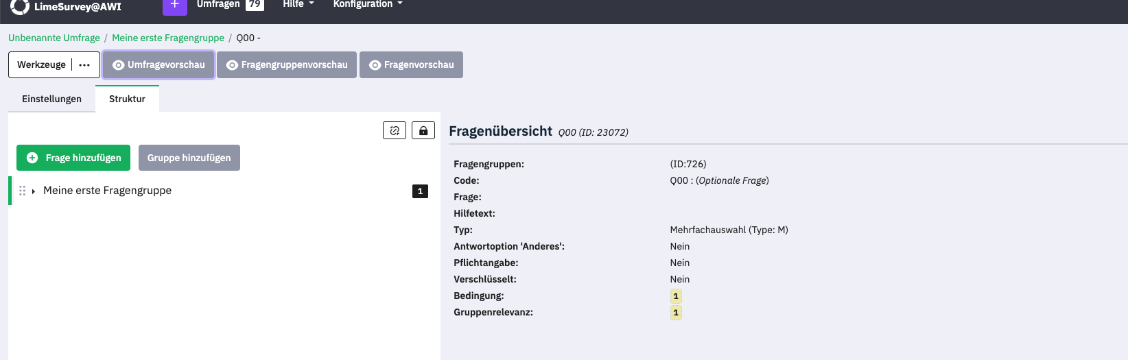 Addendum: The latest patch has changed the destination; after creating a survey, you are now taken to the page for creating questions. I cannot say whether this is intentional, instead of first setting the title, base language, etc., as was previously the case. |