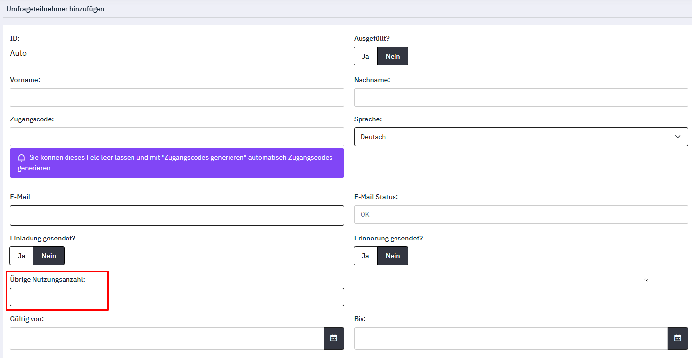 | Summary | 20229: "Uses left" value is not pre-set when creating a new participant leading to the person not being able to start the survey | ||||