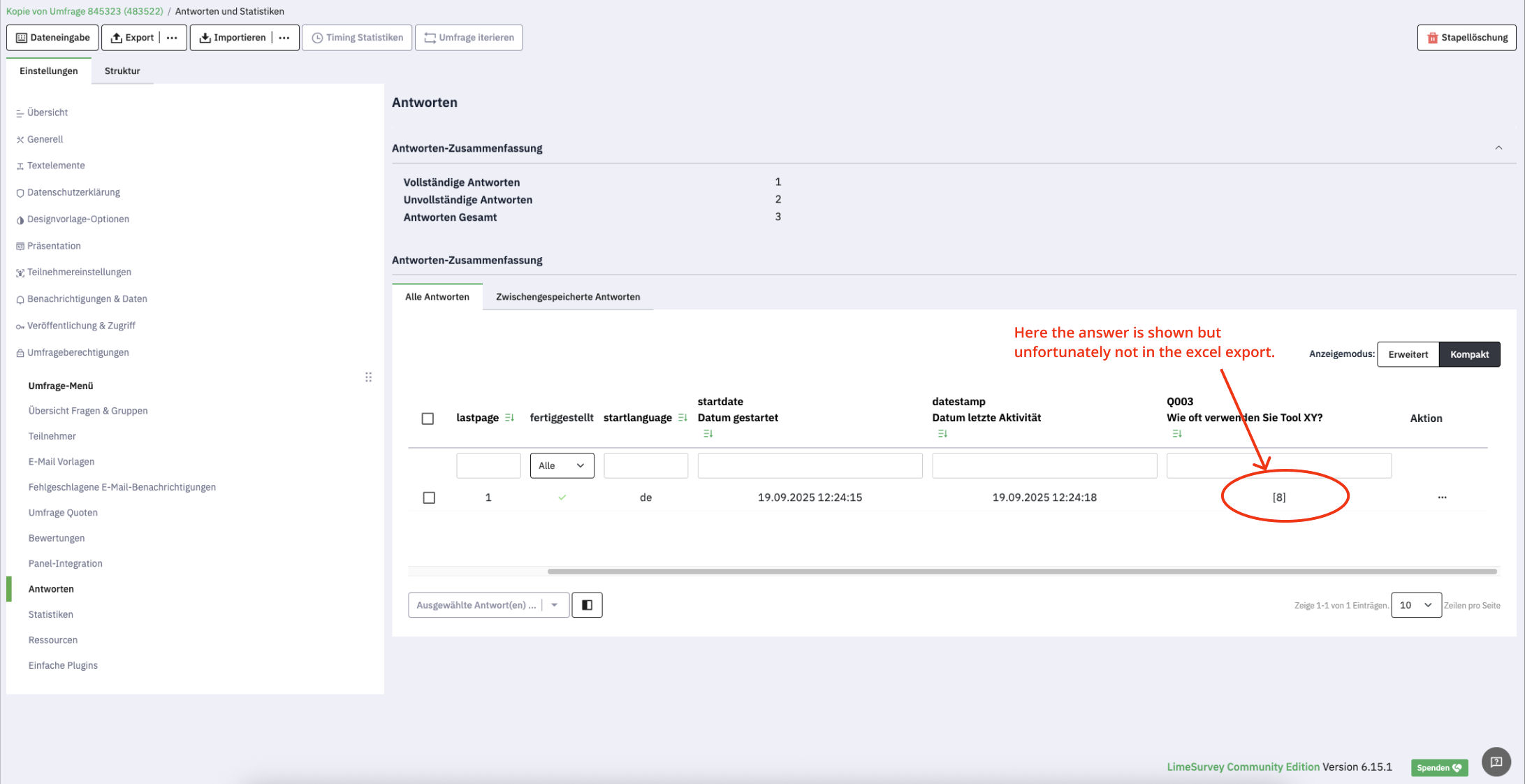 | Complete LimeSurvey version number (& build) | LimeSurvey Community Edition Version 6.15.1 | ||||