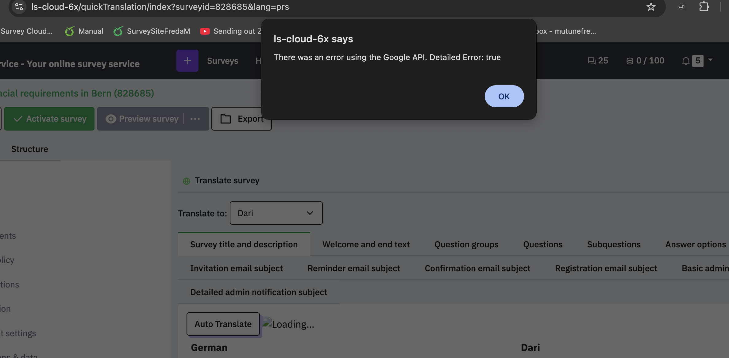 | Steps To Reproduce | Steps to reproduceCreate or open any survey with multiple languages. Add Dari (prs) or Tigrinya (ti) as an additional language. Open the “Quick Translation” tool. Attempt to auto-translate from English to the additional language. Expected resultThe translation should complete successfully, similar to other supported languages. Actual resultTranslation fails see attached screenshot. Proposed Fix: | ||||