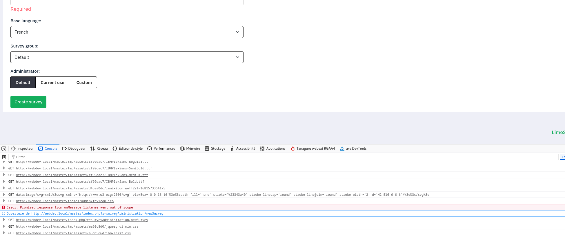 | 2025-10-20 16:41 | DenisChenu | Summary | Unable to create survey => No error are shown when an error happen when create survey |