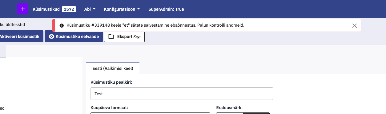 | Steps To Reproduce | Steps to reproduceAttempt to save a survey with an already existing alias, for example. This causes an error writing to the database as aliases must be unique. Expected resultThe error message shown in the alert dialog is translated. Actual resultThe error message shown in the alert dialog is not translated. (see screenshots below) | ||||