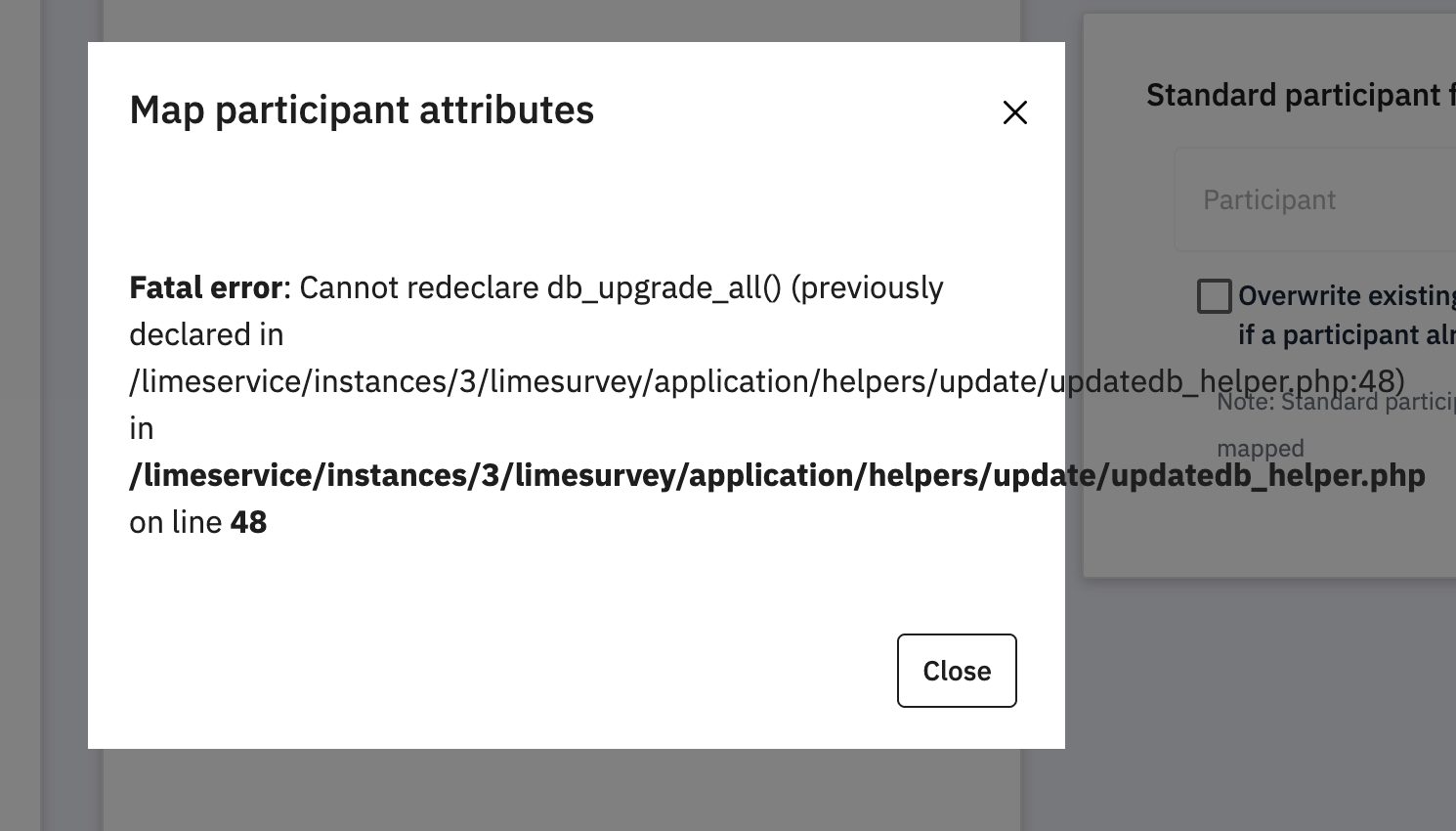 | Description | Adding a CPDB participant to a survey fails. Fatal error: Cannot redeclare db_upgrade_all() | ||||