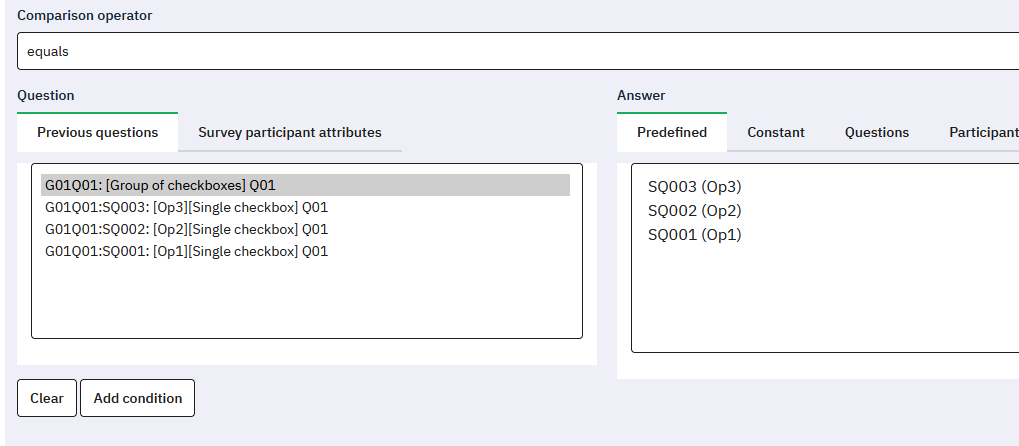 | Description | When using a multiple-choice question with “Other” enabled as a trigger for another question, “Other” does not appear in the Answer list in the Conditions Designer, making it impossible to set conditions such as showing a question when “Other” is selected. | ||||