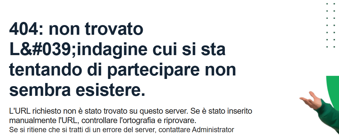 | Steps To Reproduce | Access a non-existent survey URL (e.g., https://your-domain/index.php/123456?lang=it). Observe the error message. Expected result: "404: non trovato L'indagine cui si sta tentando di partecipare non sembra esistere." Actual result: "404: non trovato L'indagine cui si sta tentando di partecipare non sembra esistere." | ||||