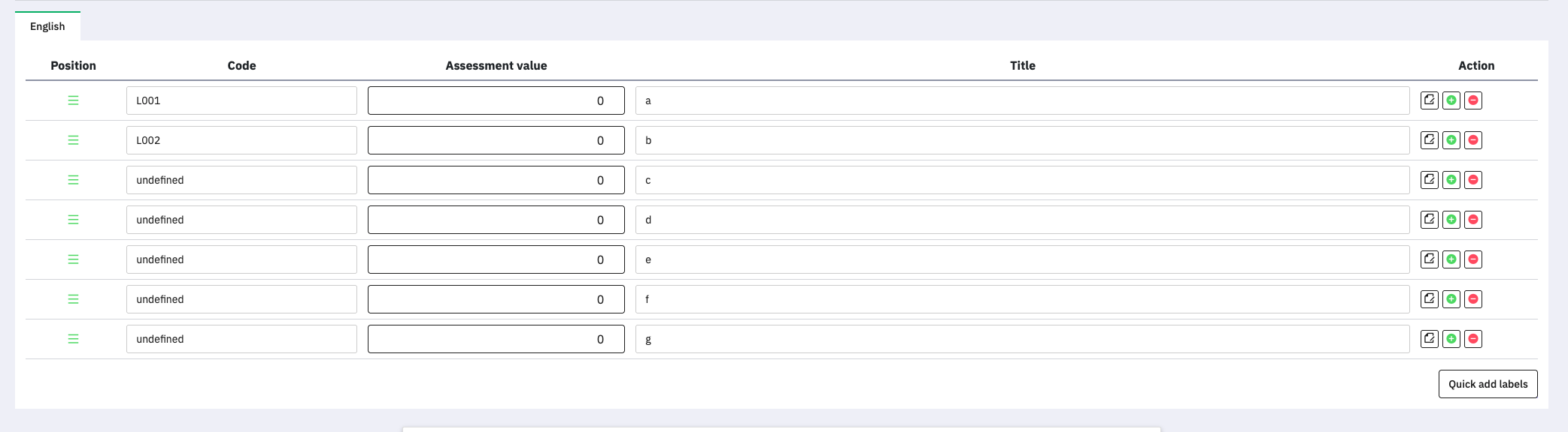 | Description | Quick add labels in label set doesn't generate label codes correctly (see screenshot) | ||||