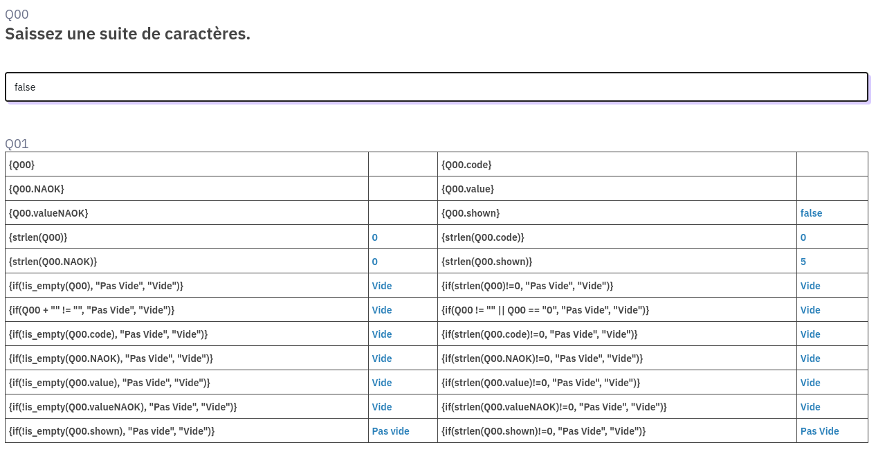 | Description | Hello I have a very simple text field question and want to check in the following question whether an answer has been entered. The various tests return valid results EXCEPT in one case: if the respondent enters “false” in lowercase. My tests : The only valid test is the one using “.shown”; all the others fail. | ||||