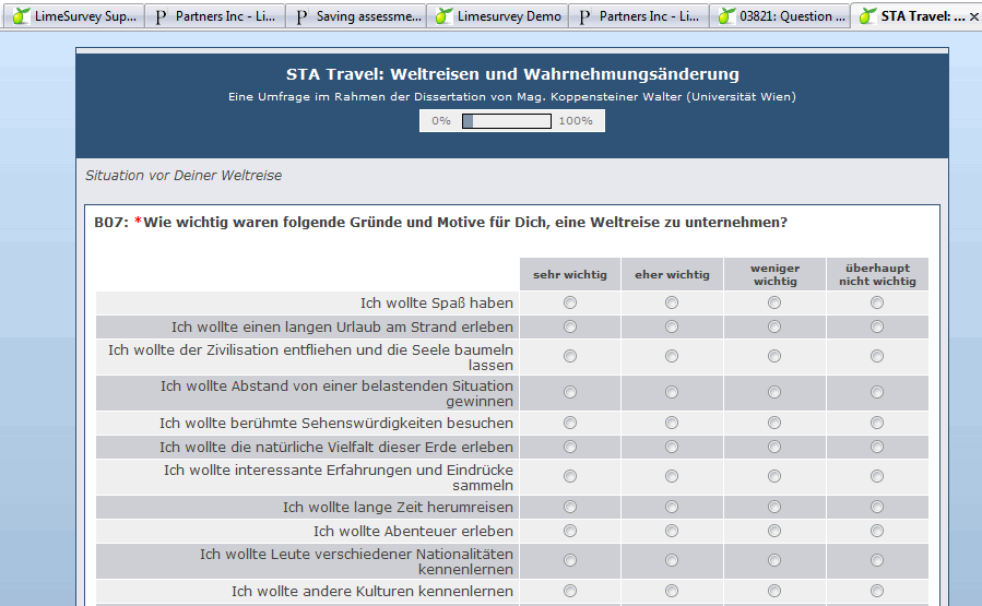 "2477","56261","414",";","A05","<p><script type=""text/javascript"" charset=""utf-8"">\n\n$(document).ready(function() {\n\n// A function to add or remove rows of an Array (Multi Flexible)(Text) question\nfunction varLengthArray(qID) { \n \n // The HTML content of the Add/Remove elements - modify as you wish\n var addContent = ' [+] weiteres Land hinzufügen';\n var removeContent = '[-] letztes Land entfernen';\n \n // Just some initialization stuff\n var arrayRow = '#question' + qID + ' table.question tbody tr';\n var rowCount = '';\n \n // Initially hide all except first row\n $( arrayRow ).each(function(i) {\n if ( i > 0 ) {\n // We also need to give the hidden rows a name cause IE doesn't \n // recognize jQuery :visible selector consistently\n $( this ).attr('name', 'hidden').hide();\n rowCount = i;\n }\n });\n \n // Create the Add and Remove elements & insert them\n var el1 = document.createElement('div');\n el1.setAttribute('id','addButton');\n document.body.appendChild(el1);\n var el2 = document.createElement('div');\n el2.setAttribute('id','removeButton');\n document.body.appendChild(el2);\n // Move them to after the array\n $( 'div#addButton' ).appendTo($( '#question' + qID + ' div.answers' ));\n $( 'div#removeButton' ).appendTo($( '#question' + qID + ' div.answers' ));\n // Insert their HTML\n $( 'div#addButton' ).html( addContent );\n $( 'div#removeButton' ).html( removeContent );\n // Style the elements - you can modify here if you wish\n $( 'div#addButton' ).css({\n //'margin':'-10px 0 0 10px',\n 'margin':'0px 0 0 10px',\n 'padding':'1px',\n 'text-align':'center',\n //'font-weight':'bold',\n 'width':'auto',\n 'cursor':'pointer',\n 'color':'green',\n //'float':'left',\n 'font-size':'small'\n });\n $( 'div#removeButton' ).css({\n //'margin':'-10px 0 0 10px',\n 'margin':'0px 0 0 10px',\n 'padding':'1px',\n 'text-align':'center',\n //'font-weight':'bold',\n 'width':'auto',\n 'cursor':'pointer',\n 'color':'red',\n //'float':'left',\n 'font-size':'small'\n });\n \n // Initially hide the Remove element\n $( 'div#removeButton' ).hide();\n \n // Call the functions below when clicked\n $( 'div#addButton' ).click(function (event) {\n addRow();\n });\n $( 'div#removeButton' ).click(function (event) {\n removeRow();\n });\n \n // Function to add a row, also shows the Remove element and hides the \n //Add element if all rows are shown\n function addRow() {\n $( arrayRow + '[name=""hidden""]:first' ).attr('name', 'visible').show();\n $( 'div#removeButton' ).show();\n if ( $( arrayRow + ':eq(' + rowCount + ')' ).attr('name') == 'visible' ) {\n $( 'div#addButton' ).hide();\n }\n }\n // Function to remove a row, also clears the contents of the removed row, \n // shows the Add element if the last row is hidden and hides the Remove \n // element if only the first row is shown\n function removeRow() {\n $( arrayRow + '[name=""visible""]:last input[type=""text""]' ).val('');\n $( arrayRow + '[name=""visible""]:last' ).attr('name', 'hidden').hide();\n $( 'div#addButton' ).show();\n if ( $( arrayRow + ':eq(1)' ).attr('name') == 'hidden' ) {\n $( 'div#removeButton' ).hide();\n }\n } \n}\n\n// Call the function with a question ID\nvarLengthArray(2477); \n});\n</script> Durch welche Länder bist Du während Deiner (letzten) Weltreise gereist, und wie lange warst Du ca. in diesen Ländern? Versuche Dich bitte genau an die Reise zurückzuerinnern, um die durchreisten Länder vollständig aufzuzählen.<br />\nWICHTIG: die Beantworung der Dauer ist für meine Arbeit besonders essentiell.</p>","","","N","N","198","0","4","de"