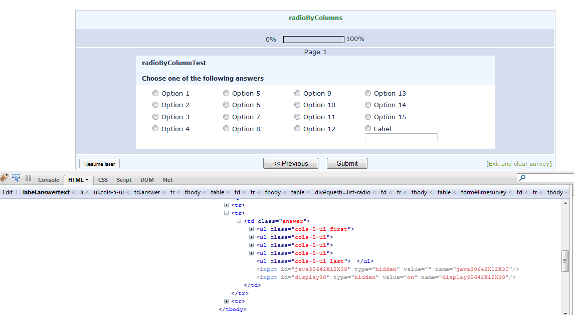 | Description | If the "Display columns" attribute of a radio question is set to 5 or 7 the lists are not displayed properly. The last column seems to be dropped or empty. In the attached image there should be 5 columns of radio buttons but the <ul class="last"> is empty so only 4 columns are displayed. I've tested all shipped templates with the same results. | ||||
