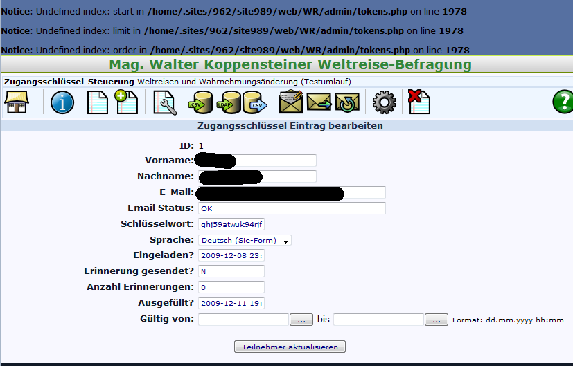 | Description | I have token controlled survey, which is not anonymous. If I clicked at browse responses at show last 50 responses and then at a token-id to see the info to a user, which answered the survey I get the following notices: Notice: Undefined index: start in /home/.sites/962/site989/web/WR/admin/tokens.php on line 1978 Notice: Undefined index: limit in /home/.sites/962/site989/web/WR/admin/tokens.php on line 1978 Notice: Undefined index: order in /home/.sites/962/site989/web/WR/admin/tokens.php on line 1978 | ||||