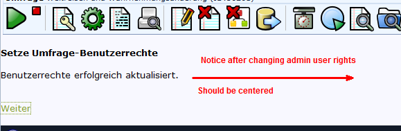 | Description | See attached screenshot ==> the notice after changing admin user rights for a survey is not centered | ||||