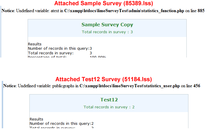 Mazi I'm still getting PHP errors - see my screenshot. The first error is using the attached limesurvey_survey_85389.lss with only the first question displayed in public stats. The second error is using the attached limesurvey_survey_51184.lss - a single numeric question survey. I can tidy up the table styles a bit but it will need to be done in all shipped templates. Do you want me to go ahead with that before the PHP errors are fixed? |