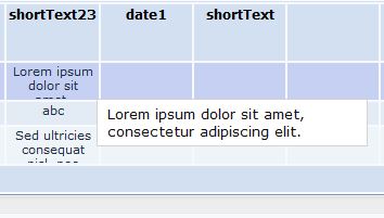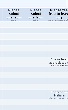 Tpartner, Thanks so much for this information. I now see what is going on. Your tooltip dialogue box always directs right. The table for viewing responses looks like it is 100% width, so when I try to use the tooltip on the cell furthest to the right, the tooltip dialogue box goes off the page and I can't see it. Can a modification be made that the last column's cell align the tooltip dialogue box to the left of the cell versus the right. Otherwise, you can't use the tooltip for any cell on the column furthest to the end. I hope I explained myself well enough. |