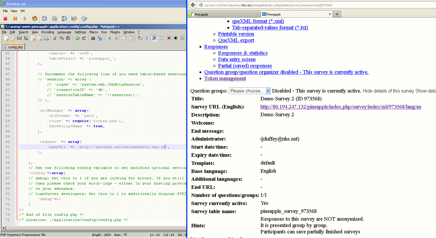 | Description | As suggested at http://docs.limesurvey.org/Tokens&structure=English+Instructions+for+LimeSurvey#Wrong_domain_in_invitation_reminder_email_link, I have added the code 'request' => array( to my config.php file. After adding this file, attempting to access the main LimeSurvey admin screen results in a text-only version. In this text-only version, surveys are still being listed by the IP address of my server, rather than the baseUrl specified in the config.php file. If I modify the baseUrl string to read 'http://surveys.northerndeanery.nhs.uk/pineapple' (where "pineapple" is the root dir of my test LimeSurvey install) then site templates, images and CSS all load properly, however the emailed URLs and the URL listed in the survey title screen are still listed by IP address. | ||||
