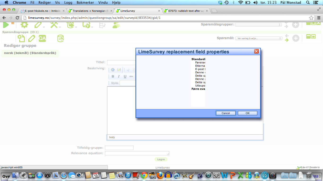 | Description | When inserting LimeSurvey fields the popup box is not translated and the values to select are truncated wrong. See enclosed screenshot. | ||||