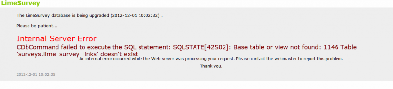 | Summary | 07096: upgrade error on table ###.lime_survey_links doesn't exist | ||||