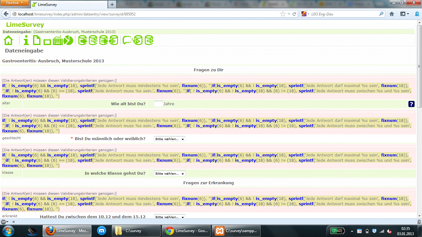 Please have a look at the screenshot. To me this is not a duplicate of 06023. The shown validation criteria (sprintf..) look very much different from expression manager code. Furthermore, the validation criteria in the example questionnaire are only set for the "age" question but are shown 3 times, also for other questions. To me this looks like a bug. If it is not, sorry for my ignorance. Is there a way to get rid of all this cryptic text in data entry mode altogether? |