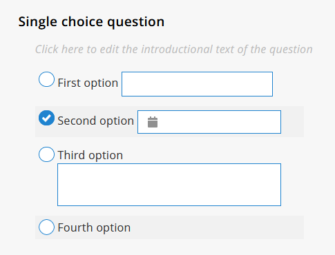 A few years have passed. The feature request to allow a free text field behind certain items still stands. To allow a activation per question is ok for the automatic OtherField, but not for the item specific fields. If you want a other field behind two items of e.g. 5 items radion button question you need to do a workaround with a few extra questions. Perhaps consider a free format question where a few questions types could be mixed into a certain layout to mimic certain questiontypes. |