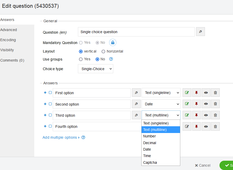 The GUI should provide a other field drop-down box behind every answer-item. See the attached screenshot for real life example. |