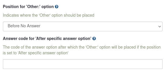 For all those who want to place the "other" option at a certain position, check: http://www.limesurvey-consulting.com/how-to-re-order-the-other-option-at-a-limesurvey-survey/ |