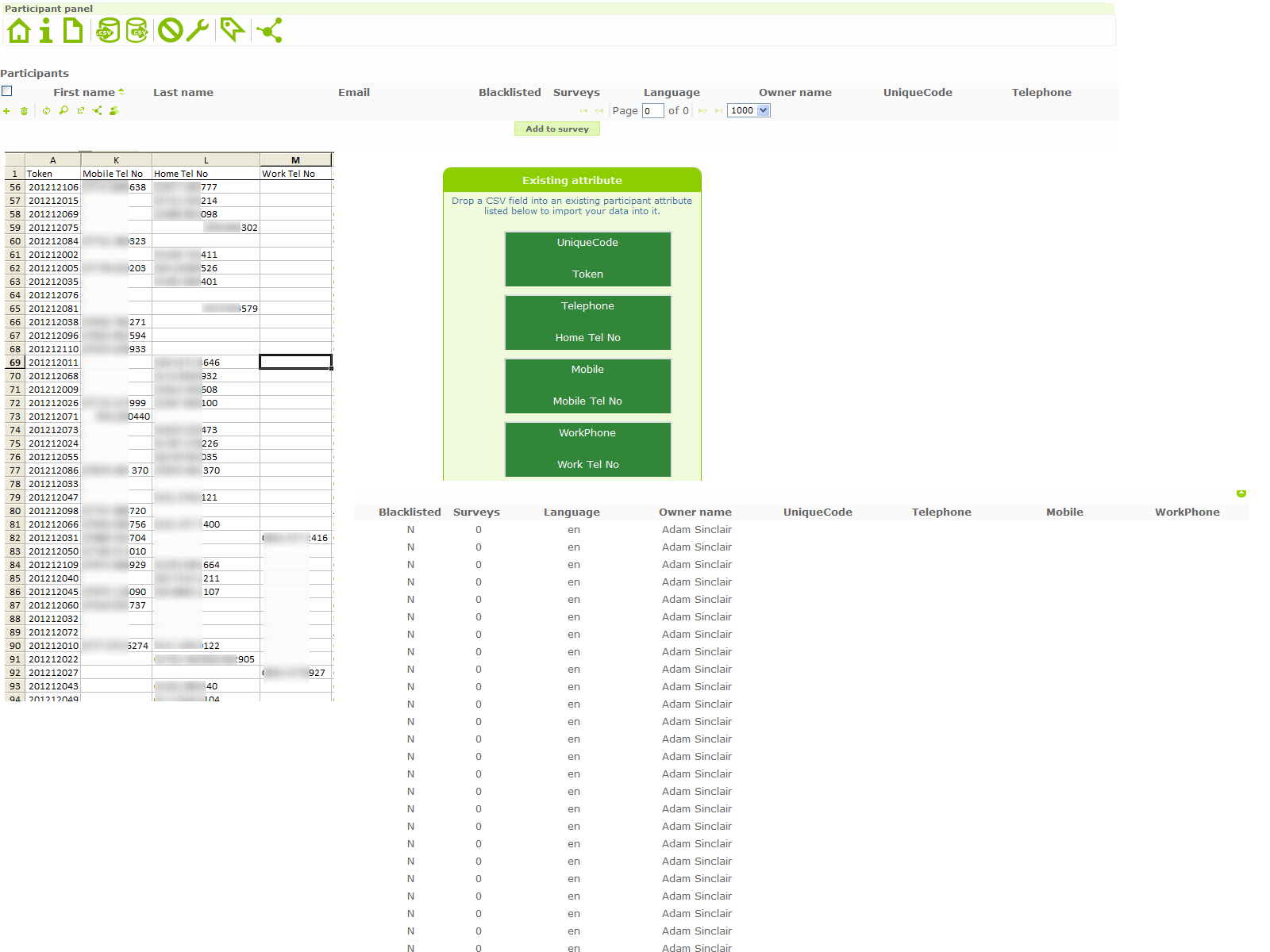 Here are my findings: Uploaded the CSV with the relevant columns named as follows Attribute Name - CSV Column Name I didn't map anything to UniqueCode, but I did map telephone to Telephone, mobile to Mobile, and Work Tel No to Workphone. UniqueCode came out blank, as expected, Telephone and Mobile came out with the correct data imported, and WorkPhone came out blank. This confirms what I thought in the previous note; that the mapping is ignored if the CSV column name does not match (case insensitively) the name of the attribute. This looks to be the same issue with survey-specific token tables, wherein importing a CSV only auto-maps columns if in the CSV the columns are named 'attribute_1', 'attribute_2', etc., and not if they are named alike to the attribute description. |