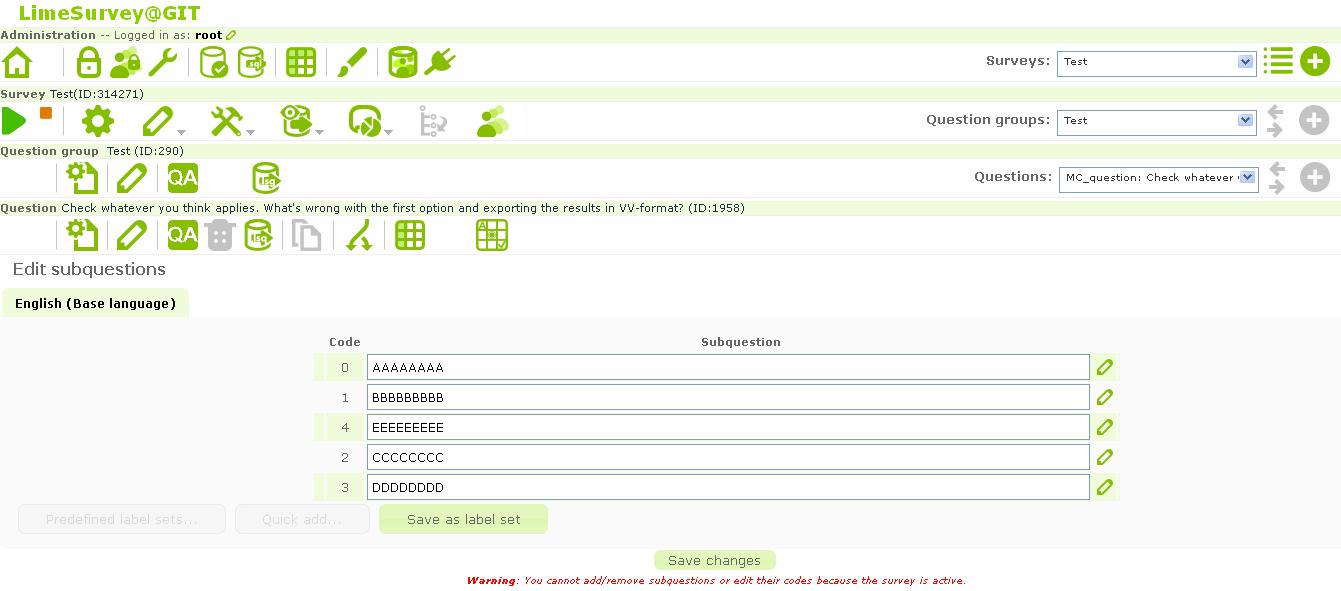 | Description | If numbers are used as subquestion code (see attached picture) it works for all except for the number zero. Number 0 is replaced by "" in the variable name (see response array in attached picture). This for example leads to values being VV-exported under code instead of [code]_0. This seems to apply to at least array and multiple choice questions. Maybe all question types with subquestions? | ||||