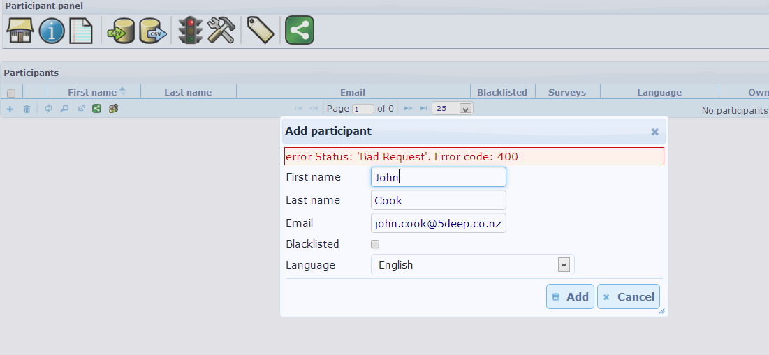 | Description | adding a new participant give a 400 server error - image below Aslo Import from csv file goes into a loop and never completes - have tried different csv file created in txt file and excel no difference. | ||||