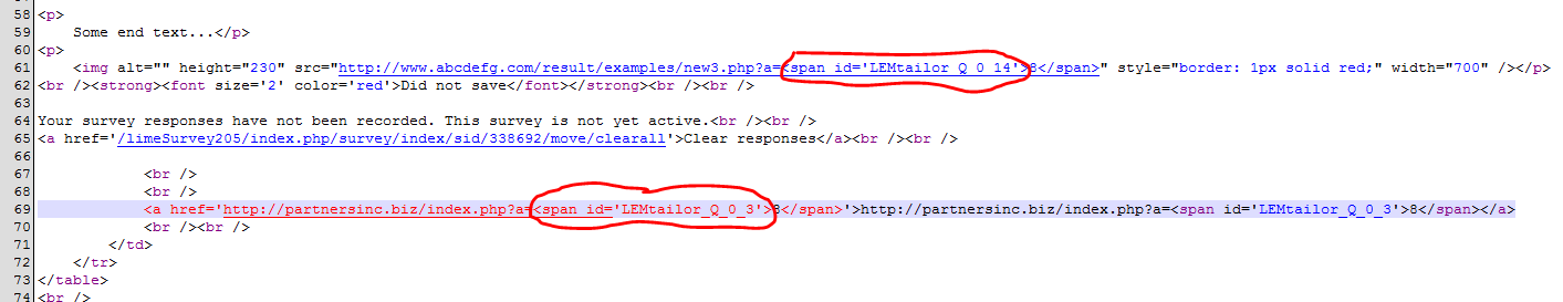 | Description | When running a survey in "all-in-one", mode values that are piped into the end message and into the end URL are wrapped in span elements. If the piped value is used in a parameter or attribute it breaks the URL or attribute (see attached screenshot). | ||||