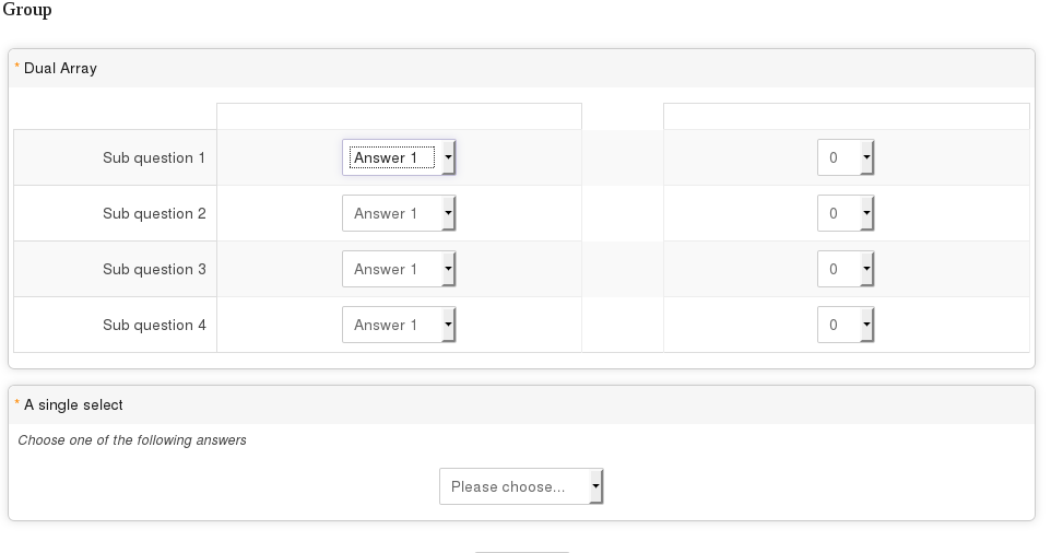 | Description | The unanswered selects in an Array dual scale (dropdown) question no longer have the "Please choose" option and if the page is submitted the first option is recorded as an answer even if the respondent does nothing. | ||||
