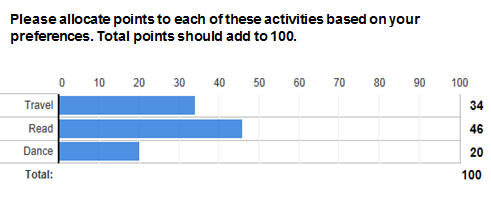 | Description | Constant sum scale is an essential component of meaningful surveys, especially those involving research. There are a range of methods used for constant sum questions such as having a remaining value that changes when data is entered, or way more cool, sliding scales. | ||||
