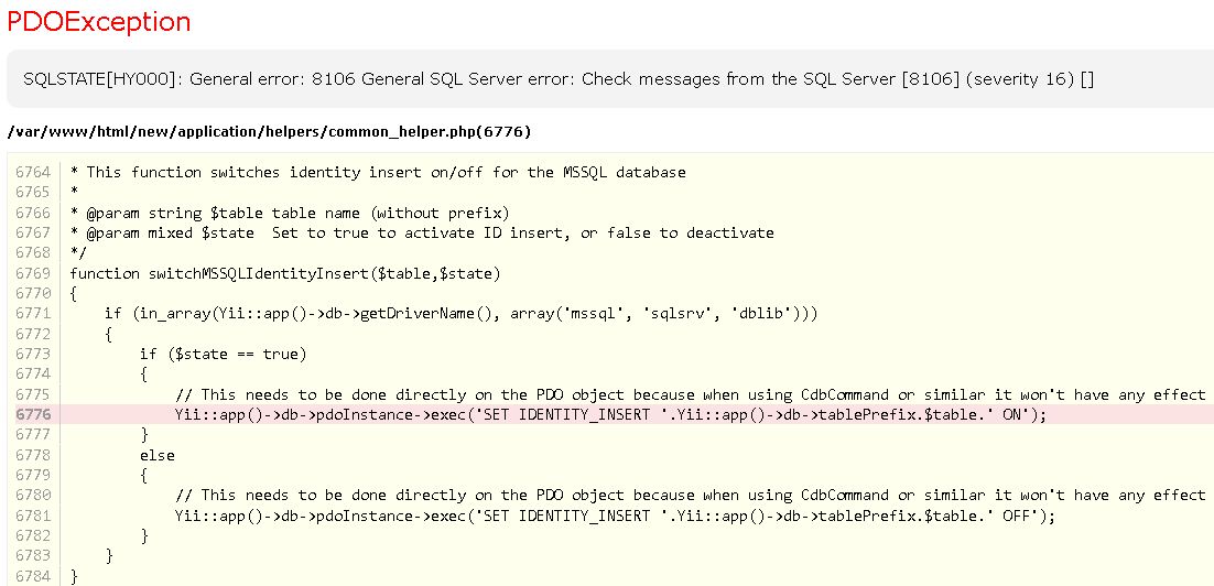 | Additional Information | /var/www/html/new/application/helpers/common_helper.php(6776) 6764 This function switches identity insert on/off for the MSSQL database | ||||