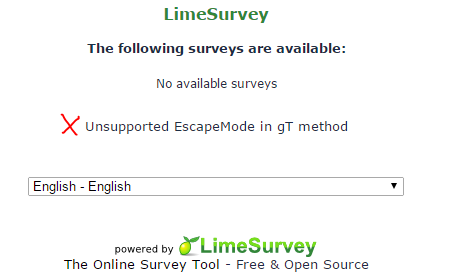 | Description | When running the latest 2.06 installer (code downloaded 2014-10-27) the installer stops with a blank/white screen at the optional settings page (URL: ...limesurvey/index.php?r=installer/optional). Previously, DB gets populated and config.php is written. When pressing F5, the LS root page usually listing the survey is shown, BUT it says "Unsupported EscapeMode in gT method", see screenshot. | ||||